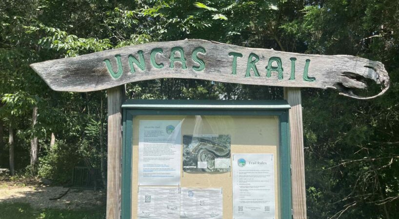 The trailhead and an informational kiosk are located at a small parking area behind the Lexington Public Works buildings. The Uncas Trail extends about three-quarters of a mile, first along the Lexington Public Works yard before turning right onto a bluff overlooking the Maury River, while passing through deciduous forest with views of karst features and outcrops. The trail then descends to the river - the left fork extends about 100 yards to a small beach on the Maury River (across the river, you can see the Lexington end of the Chessie Nature Trail); to the right, the trail follows along the river for several hundred yards before heading back up to loop into the trail. Expect plenty of birdsong, deer, and an occasional turkey.
